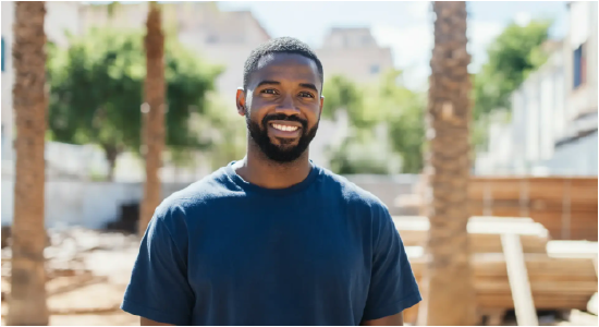 文本:一個短發胡須男子微笑著看著鏡頭。背景模糊,可以看到淺影的樹木和建筑。