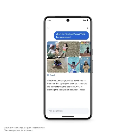 AI甚至還可以幫助用戶進行歸納總結。用戶可以提出更為復雜的問題,“女兒的游泳技能是怎么提升的?”谷歌不僅會搜索相關的女兒游泳照片,還可以提供一段簡單的說法,幫助用戶更好的回憶女兒的游泳技能的提升過程。