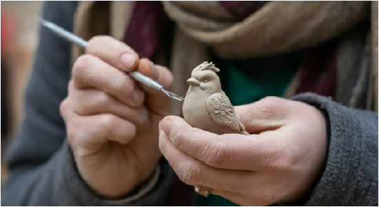 文本:一只手握著一個泥塑小鳥雕像,另外一只手拿著刻刀。可以看到雕刻著的圍巾。他的雙手沾滿粘土。用一張近攝的單反圖片突出紋理和雕刻質感。