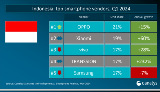 5月16日晚間消息,根據國際數據公司 (IDC) 全球數據,2024年第一季度印尼手機市場同比增長27.4%,環比增長11.5%,達到1000萬部。 手機廠商利用齋月旺季銷售帶來了可觀的出貨量。在經歷了幾個季度的低出貨量之后,手機廠商為渠道補倉,這為第一季度的強勁增長奠定了基礎。