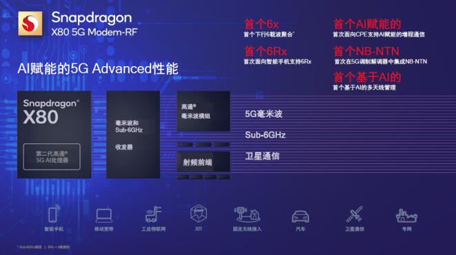 在今年MWC巴塞羅那上,高通公司推出的全新5G調制解調器及射頻系統——驍龍X80,就是我們將前沿AI和無線連接技術相融合的最新成果。驍龍X80集成專用5G AI處理器和5G Advanced-ready架構,實現了多項全球首創的里程碑,包括首次面向智能手機支持6路接收、首個下行六載波聚合等,帶來全新水平的5G性能和體驗。