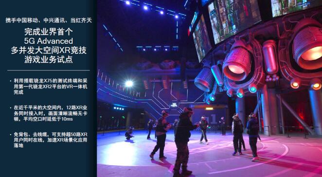 技術創新也為XR產業帶來了前所未有的機遇。今年2月,我們攜手中國移動、中興通訊和當紅齊天,完成了業界首個5G Advanced多并發大空間XR競技游戲業務試點。該驗證利用搭載高通解決方案的終端,在近千平米的大空間內,12路XR業務同時接入時,畫面清晰流暢無卡頓,平均空口時延低于10ms,免背包、去線纜,可支持超50路XR用戶同時在線,擴展了XR場景化應用空間。