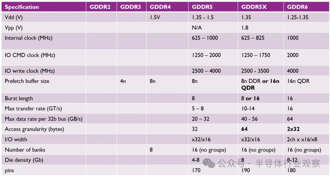 可以看出,從最初的GDDR到最新的GDDR6,GDDR內(nèi)存經(jīng)歷了多次技術(shù)迭代和性能提升。每一代GDDR內(nèi)存都在數(shù)據(jù)傳輸速率、帶寬和能效方面不斷優(yōu)化,滿足了GPU和圖形處理日益增長的需求。如今,它已成為人工智能和大數(shù)據(jù)應(yīng)用領(lǐng)域中最受歡迎的內(nèi)存芯片之一。