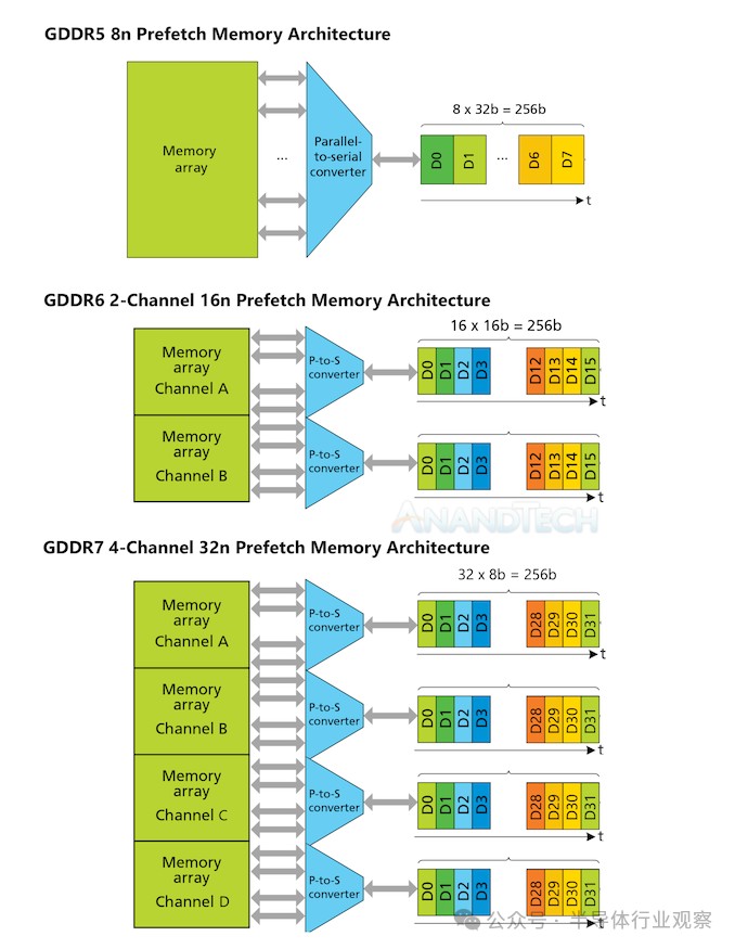 圖表展示了GDDR7相對于前幾代在帶寬、功耗和封裝上的顯著改進。來源:anandtech