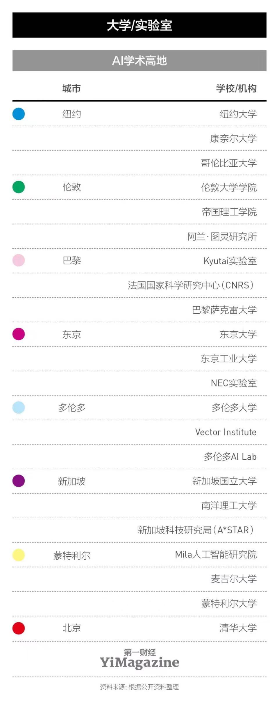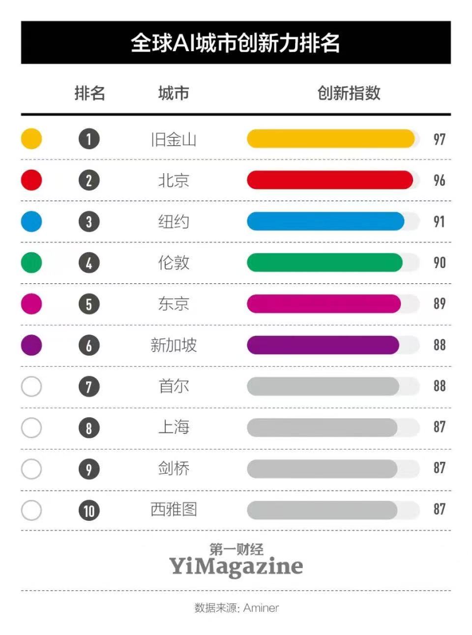 生成式AI帶來新的洗牌機會,但能否抓住這樣的機會取決于很多因素。我們選擇和調(diào)查了過去一年來以人工智能之名在各大媒體上頻繁露出的幾個城市,嘗試回答“到底哪個城市能抓到大機會”這一問題。巧合的是,在訪問了蒙特利爾、硅谷、紐約、倫敦、巴黎、新加坡、北京和東京等幾個城市的相關(guān)人士后,我們發(fā)現(xiàn)一個叫AMiner的機構(gòu)在跟蹤全球人工智能領(lǐng)域10年發(fā)展后提出的創(chuàng)新城市排名,與我們的調(diào)查選擇幾乎重合。AMiner的榜單衡量了全球各地論文、學(xué)者、機構(gòu)的數(shù)量與質(zhì)量,以及這些城市與國際合作的指數(shù)——選擇和采訪當(dāng)?shù)厝耸繒r,我們也逐一涉及了這些維度。那么,所謂的巧合其實是種必然。