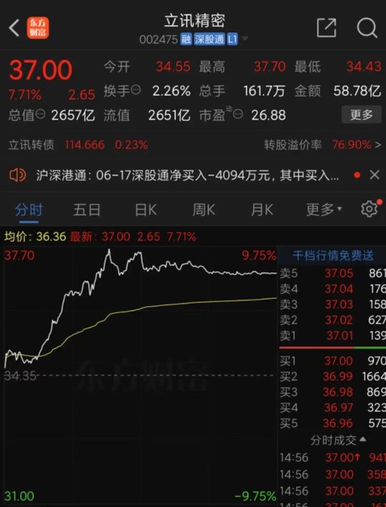 6月17日,立訊精密股價大漲7.71%,截至收盤報37元/股,總市值2657億元。業內人士認為,股價大漲或與英特爾的入股有關。