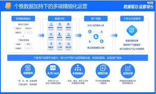 值得一提的是,個推用戶運營平臺不僅沉淀了個推的數據能力,還對個推的數智運營服務經驗進行了產品化。平臺內置了豐富的規則標簽模板、算法模板以及適用于不同行業APP的運營策略模板,幫助企業更加高效的開展數據驅動的精細化運營實踐。同時,平臺也提供流程畫布、A/B test等功能,支持企業快速、智能地驗證運營策略,并對有效的策略進行一鍵復用和沉淀,從而持續升級數智運營能力,助力企業用戶增長。