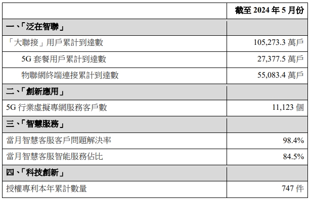 數據顯示,截至2024年5月份,中國聯通“大聯接”用戶累計達10.52733億戶,物聯網終端連接累計達5.50834億戶,5G行業虛擬專網服務客戶數達11123個,當月智慧客服服務問題解決率達98.4%,當月智慧客服智能服務占比達84.5%,授權專利本年累計數量達747件。