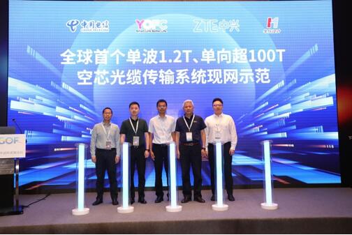 隨后進(jìn)入成果發(fā)布環(huán)節(jié),中國(guó)電信研究院網(wǎng)絡(luò)技術(shù)研究所副所長(zhǎng)雷波介紹了中國(guó)電信“全球首個(gè)單波1.2T、單向超100T空芯光纜傳輸系統(tǒng)現(xiàn)網(wǎng)示范”成果,并邀請(qǐng)中國(guó)電信杭州分公司建設(shè)部副總經(jīng)理李俊、長(zhǎng)飛光纖高級(jí)副總裁閆長(zhǎng)鹍、中興通訊電信總監(jiān)辦副總監(jiān)張?jiān)讫埡腿A信設(shè)計(jì)院高級(jí)顧問(wèn)沈梁上臺(tái)參與成果發(fā)布儀式。
