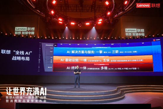 “‘一體多端’戰(zhàn)略和發(fā)展理念,目標(biāo)只有一個,那就是讓用戶在工作、學(xué)習(xí)和生活的不同場景下,都能獲得‘個人AI助理’新體驗(yàn)。”除了在以“一體多端”戰(zhàn)略領(lǐng)跑AI PC、AI手機(jī)、AI平板和AIoT等“AI內(nèi)嵌的智能終端”外,聯(lián)想還在“AI導(dǎo)向的基礎(chǔ)設(shè)施”和“AI原生的方案服務(wù)”領(lǐng)域取得了明顯突破,三者共同推進(jìn)著聯(lián)想的“全棧AI”戰(zhàn)略布局。