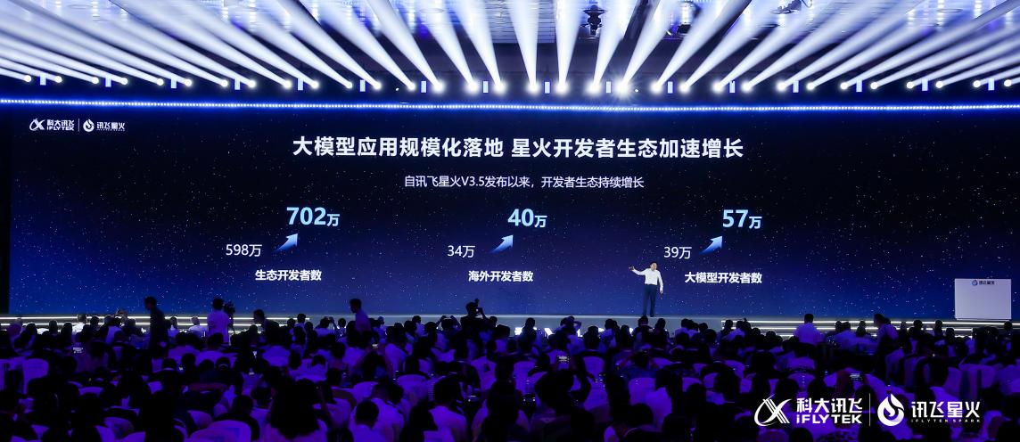 訊飛星火大模型帶來行業賦能的同時,也在助力開發者生態蓬勃發展。自今年1月30日訊飛星火V3.5發布以來,短短5個月,星火開發者生態加速增長,開發者數從598萬增長到702萬,新增超104萬;海外開發者數超40萬;大模型開發者達57萬。越來越多開發者正加入星火生態,釋放更多剛需場景的應用價值。