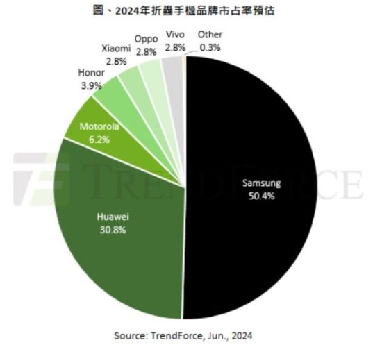 從各廠商表現來看,最早入局折疊屏手機的三星,如今開始面臨多家廠商的競爭,市場份額從2022年的八成降至現在五成。華為在2023年折疊手機市占率首次突破雙位數,達12%。2024年華為更是推出升級版5G折疊手機,包括Mate X5, Pocket 2,預期今年第三季,華為將再推出市面上第一部三折手機,預計市場份額有望接近三成。