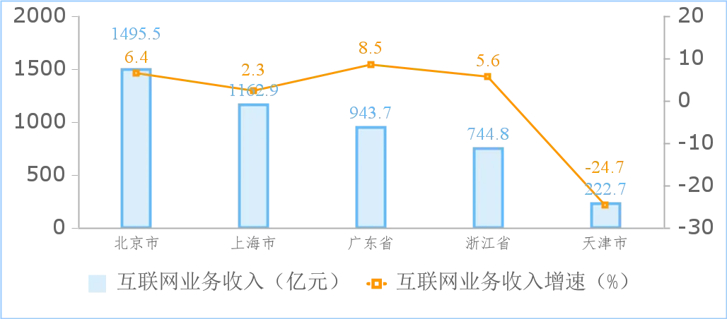 超半數地區互聯網業務增速保持增長勢頭。1—4月份,互聯網業務累計收入居前5名的北京(增長6.4%)、上海(增長2.3%)、廣東(增長8.5%)、浙江(增長5.6%)和天津(下降24.7%)共完成業務收入4569.6億元,同比增長3.6%,占全國(扣除跨地區企業)互聯網業務收入的82.4%。全國互聯網業務收入實現正增長的。▍^、市)有17個,其中甘肅、安徽增速超60%,新疆、西藏、吉林降幅超30%。