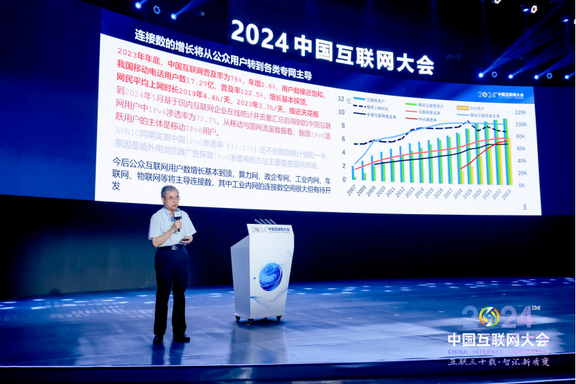 鄔賀銓以“全功能接入半甲子 新引擎加持再出發(fā)”為主題發(fā)表主旨報告。他指出,中國全功能接入互聯(lián)網(wǎng)有30年的歷史,經(jīng)歷了數(shù)字化、網(wǎng)絡(luò)化的時代,進(jìn)入到互聯(lián)網(wǎng)的數(shù)字化時代。在整個發(fā)展中,現(xiàn)在來到了人工智能的新風(fēng)口。55年歷史的互聯(lián)網(wǎng),30年的全功能接入,互聯(lián)網(wǎng)為中國社會經(jīng)濟的發(fā)展和民生服務(wù)做出了積極的貢獻(xiàn);ヂ(lián)網(wǎng)需要在新的時期數(shù)字化轉(zhuǎn)型和高質(zhì)量發(fā)展中找準(zhǔn)位置,抓住時代機遇,實現(xiàn)使命擔(dān)當(dāng)。