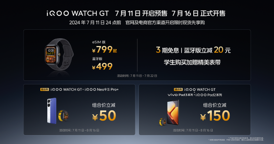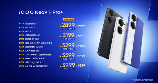iQOO Neo9S Pro+共有Buff藍、星曜白和格斗黑三種配色,提供12GB+256GB、12GB+512GB、16GB+256GB、16GB+512GB和16GB+1TB存儲組合可選,到手價2899元起;iQOO WATCH GT eSIM版售價799元起,藍牙版499元,7月11日—7月22日下單藍牙版立減20元,到手價僅需479元; iQOO Pad2 Pro到手價 3299元起;iQOO TWS 1i售價 99元,與iQOO Neo9S Pro+組合購買可享至高40元優惠,到手僅需59元。