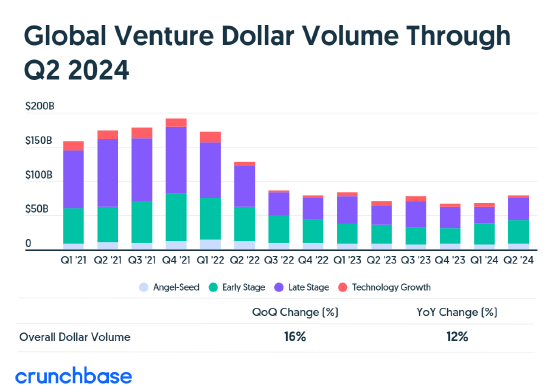 Crunchbase數據還顯示,盡管第二季度融資額有所增加,但今年上半年的融資額出現了下滑。上半年,全球初創公司融資額為1470億美元,同比下滑5%,低于2023年上半年的1540億美元,但與2023年下半年持平。