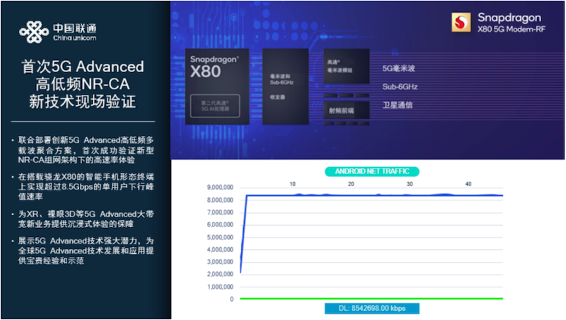 MWC上海展前夕,中國聯(lián)通研究院聯(lián)合高通完成首次5G-A高低頻NR-CA新技術(shù)現(xiàn)場驗證,利用了高頻段的800MHz帶寬與3.5GHz低頻段的100MHz帶寬進(jìn)行載波聚合,在采用搭載驍龍X80調(diào)制解調(diào)器及射頻系統(tǒng)的智能手機(jī)形態(tài)終端上實現(xiàn)了超過8.5Gbps的單用戶下行峰值速率,為XR、裸眼3D等5G-A大帶寬新業(yè)務(wù)提供了沉浸式體驗的保障。