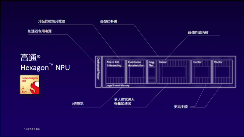 以目前正在被大量旗艦智能手機(jī)采用的第三代驍龍8為例,高通為了實現(xiàn)更好的功耗控制,專門為Hexagon NPU配備了加速器專用電源,同時進(jìn)行了微架構(gòu)升級以實現(xiàn)性能提升。今年2月的MWC巴塞羅那期間,高通首次在Android平臺上通過搭載第三代驍龍8參考設(shè)計的終端運(yùn)行了基于圖像和文本輸入、超過70億參數(shù)的大語言和視覺助理大模型技術(shù)演示,再次證明了終端側(cè)AI的能力潛質(zhì)。