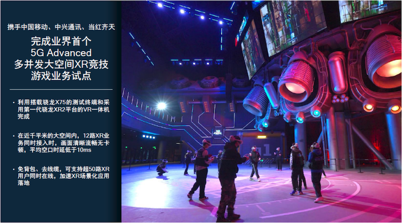 XR正在面臨的變革也是一個極好的例證。今年初,高通攜手中國移動、中興通訊和當(dāng)紅齊天,完成了業(yè)界首個5G Advanced多并發(fā)大空間XR競技游戲業(yè)務(wù)試點,利用搭載高通解決方案的終端,在近千平米的大空間內(nèi),12路XR業(yè)務(wù)同時接入時,畫面清晰流暢無卡頓,平均空口時延低于10ms,帶來免背包、去線纜的多并發(fā)大空間XR競技游戲體驗。