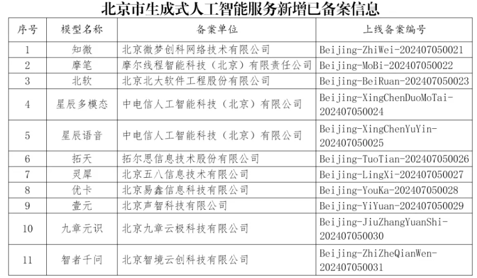 北京市生成式人工智能服務新增已備案信息顯示,新增生成式人工智能模型包括北京微夢創科網絡技術有限公司的“知微”、摩爾線程智能科技(北京)有限責任公司的“摩筆”、北京北大軟件工程股份有限公司的“北軟”、北京九章云極科技有限公司的“九章元識”、北京智境云創科技有限公司的“智者千問”等。