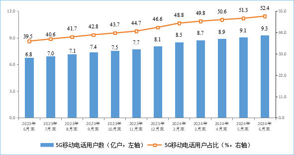 飛象網訊(致新/文)7月23日消息,根據工信部今日發布的《2024年上半年通信業經濟運行情況》顯示,截至2024年6月末,三家基礎電信企業及中國廣電的移動電話用戶總數達17.77億戶,比上年末凈增2401萬戶。其中,5G移動電話用戶達9.27億戶,比上年末凈增1.05億戶,占移動電話用戶的52.4%。