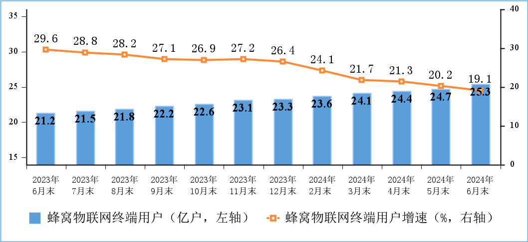截至6月末,三家基礎電信企業發展蜂窩物聯網終端用戶25.29億戶