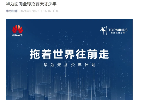 7月23日,華為招聘在微信公眾號發(fā)文稱,面向全球招聘新一批天才少年。要求為不限學校,不限專業(yè),不限學歷;在數理化、計算機、人工智能等領域有特別建樹,如有重量級科研成果、論文、專利或國際頂級競賽獲獎等;有志成為行業(yè)技術領軍人物。