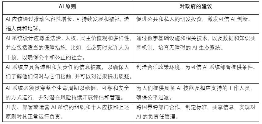 OECD和G20于2019年通過的AI原則,成為政府和組織建構以人為本的可信AI方法的全球基準。這些原則于2016年開始的有關AI使用應遵循的核心道德原則的公開討論之后制定,原則涵蓋了諸如確保AI的好處在社會廣泛傳播、AI不破壞諸如保護人權等社會保障措施,以及使用AI的組織是否已建立適當的治理和問責制度等方面。下表是OECD的AI原則及其對政府政策制定的建議。