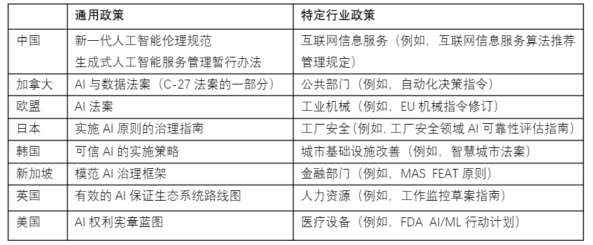 我國等全球各國正區別行業通用和特定因素制定雙重AI監管政策:跨行業方法構建的基本框架,為無論在哪個行業開發或使用AI,都能提供基本的保護措施;行業特定方法則為解決具體行業風險,對AI使用制定了額外的指導方針。下表是各國通用和特定行業雙重AI監管政策舉例。