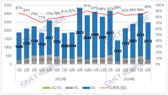 飛象網訊 7月29日,中國信通院數據顯示,2024年6月,國內市場手機出貨量2491.2萬部,同比增長12.5%,其中,5G手機2213.1萬部,同比增27.8%,占同期手機出貨量的88.8%。2024年1-6月,國內市場手機出貨量1.47億部,同比增長13.2%,其中,5G手機1.24億部,同比增長21.5%,占同期手機出貨量的84.4%。