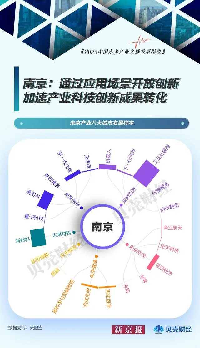 南京積極布局未來產業,2023年1月發布《南京市加快發展未來產業六大專項行動計劃》,并通過應用場景開放創新,加速產業科技創新成果轉化,累計對外發布應用場景超4000個,其開放合作模式得到廣泛認可。未來產業之城發展指數的產業維度綜合評價,南京總分排在第八,在未來信息、未來空間、未來健康、未來材料的部分產業上具有相對優勢。