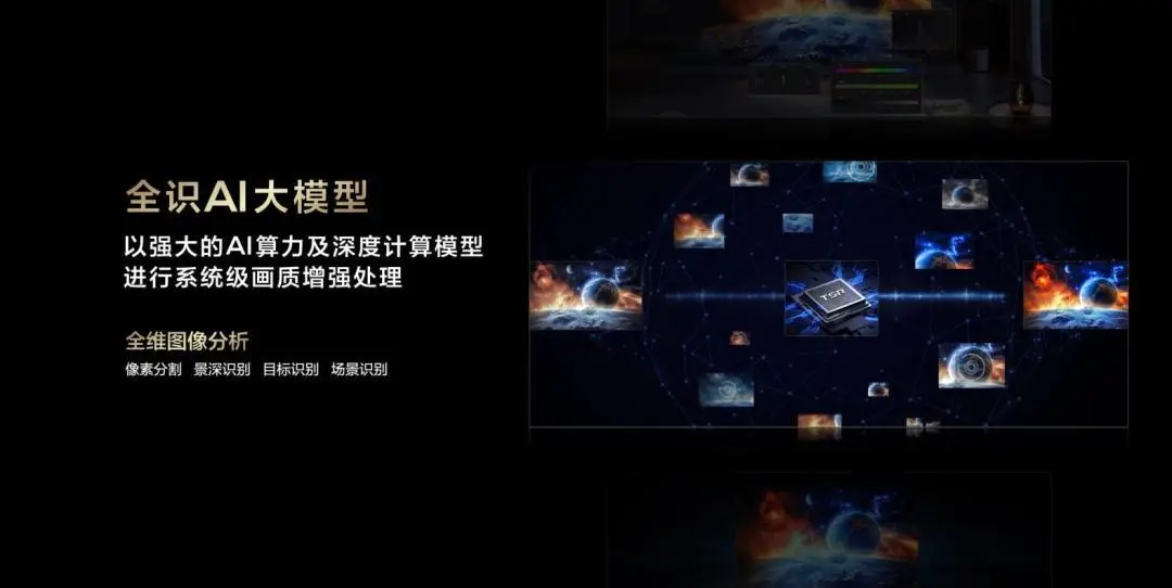 再看看TCL X11H,采用了TCL自研TSR獨立畫質芯片搭配上自研全識AI大模型的組合,以強大的AI算力及深度計算模型為基礎,通過全域信息采集、全維圖像分析、全景畫質增強三個步驟對畫質進行系統化處理,從而帶來更符合人眼觀看的畫質效果。