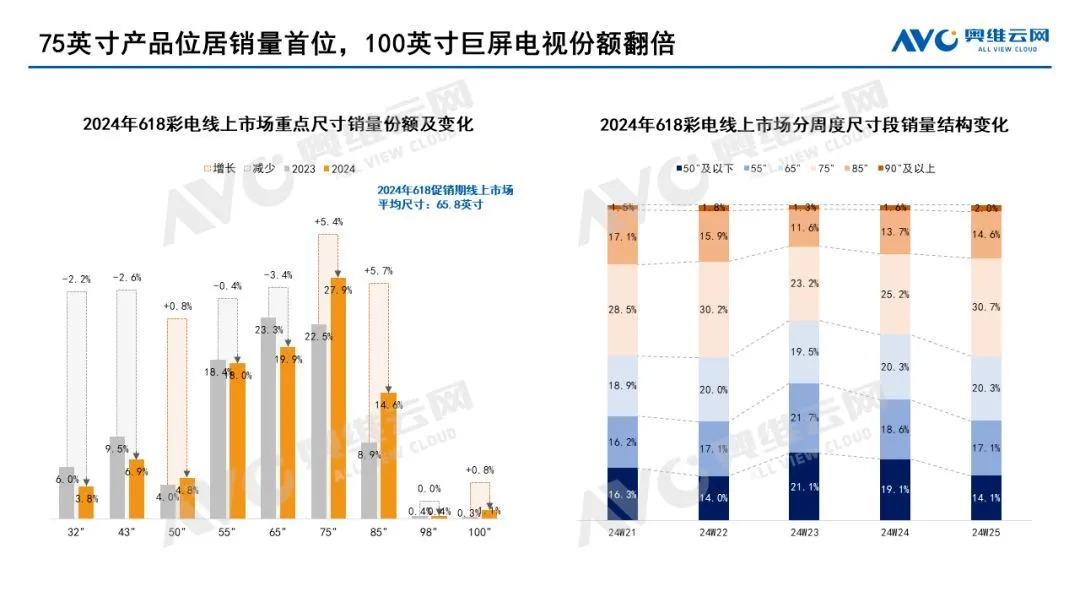 根據奧維云網線上監測數據顯示,2024年618期間彩電線上市場平均尺寸已經達到65.8英寸,大屏化進程顯著加快。根據洛圖科技(RUNTO)最新的零售監測數據,如果從尺寸結構來看,在線上和線下零售市場,75英寸電視均已經成為銷量最高的尺寸。