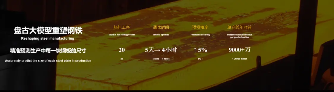 而現在,華為云的盤古大模型5.0創新地將時序數據、表格數據、工藝參數、行業機理等進行token化,通過大模型的學習,實現對最優參數的預測。目前,盤古大模型已經在寶鋼1880熱軋生產線上線,使寶鋼的精軋寬展預測精度較傳統模型提升了5%以上,鋼板成材率提升0.5%,更將調整生產參數的時間從過去的5天甚至一周以上縮短至3-4小時,年收益因此增加了9000余萬元。下一步,華為云還要與寶鋼一起挑戰鋼鐵行業最困難的高爐場景。