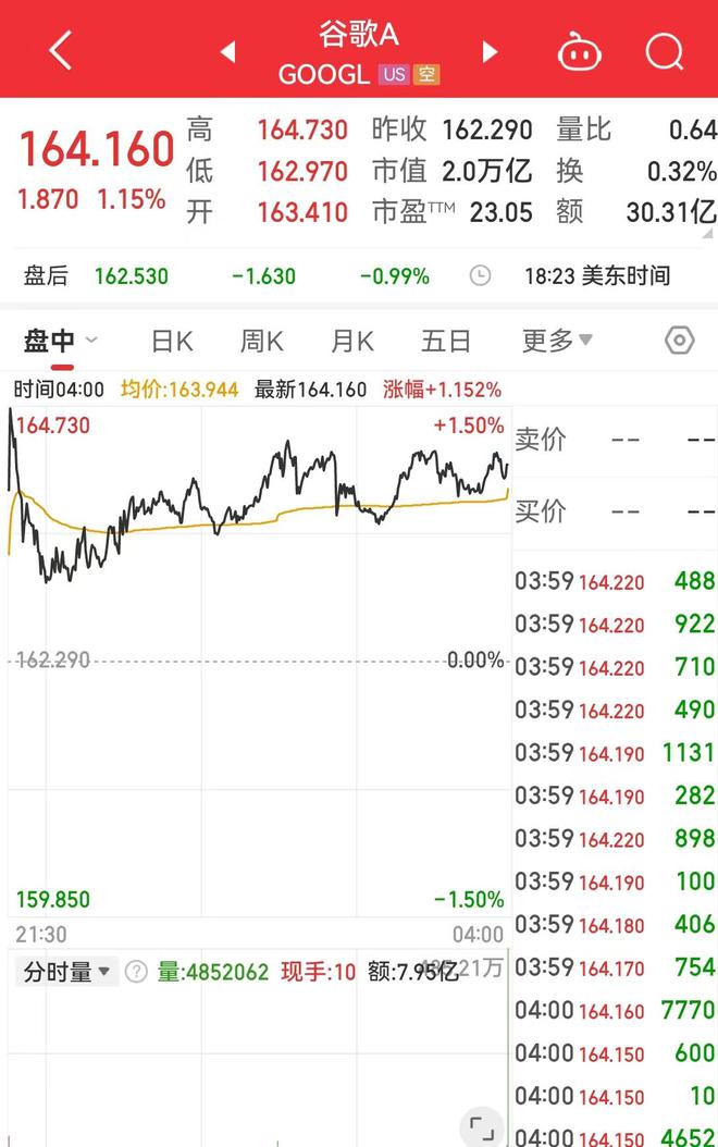 截至當地時間8月13日收盤,谷歌A報164.16美元,漲幅1.15%,市值2.0萬億美元。