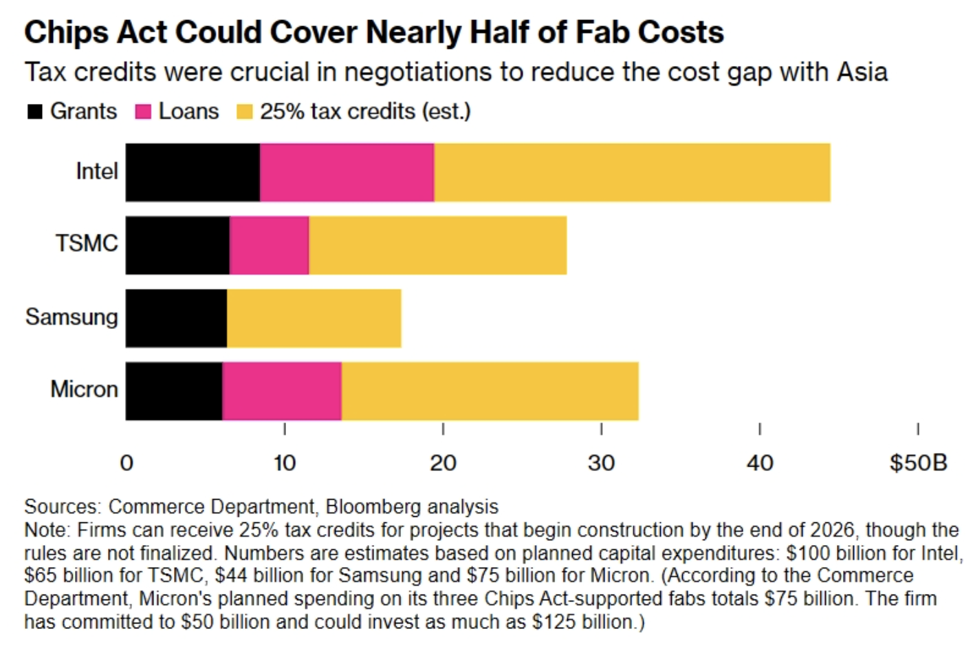 此外,美國商務部授予臺積電66億美元、三星64億美元以及美光61.4億美元的補貼。