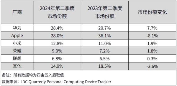 2024年第二季度中國平板電腦市場出貨量排名前五廠商市場表現如下: