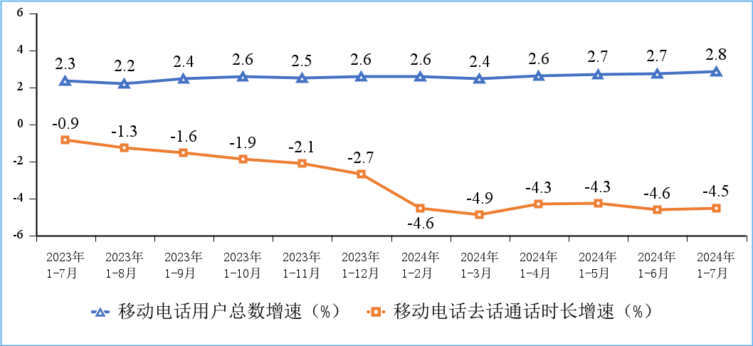 電話通話量小幅下降,移動短信量收平穩增長。1—7月份,移動電話去話通話時長完成12518億分鐘,同比下降4.5%;固定電話主叫通話時長完成450.7億分鐘,同比下降2.1%。1—7月份,全國移動短信業務量同比增長1%;移動短信業務收入同比增長1.6%。