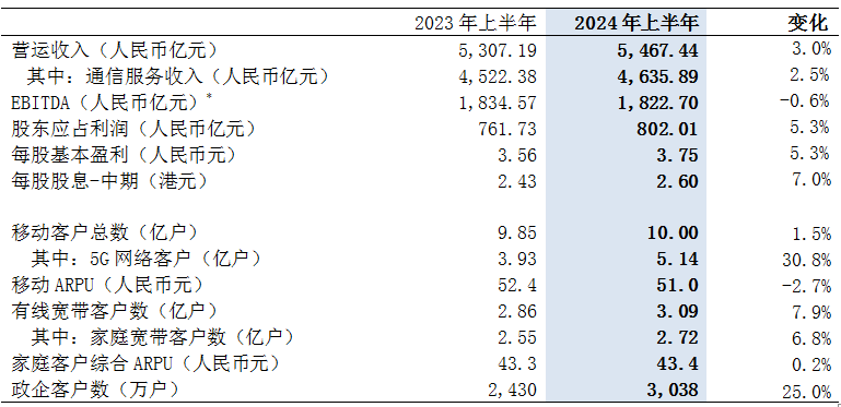 股東應占利潤為人民幣802億元,同比增長5.3%,每股盈利為人民幣3.75元;EBITDA為人民幣1,823億元, EBITDA占通信服務收入比為39.3%;年化凈資產收益率到達11.8%,同比提升0.3個百分點,盈利能力繼續保持國際一流運營商領先水平。資本開支為人民幣640億元,自由現金流為人民幣674億元。