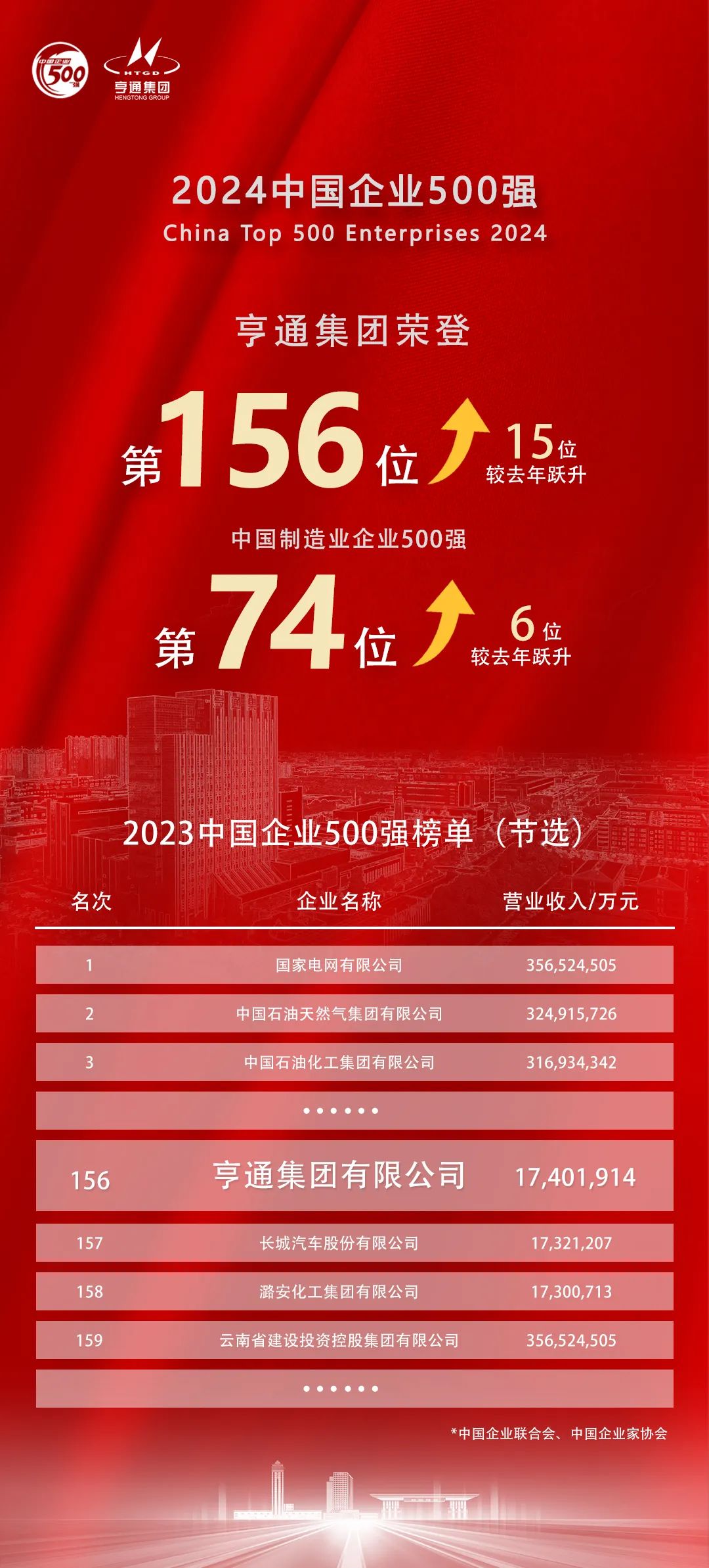 今天,由中國企業(yè)聯(lián)合會(huì)、中國企業(yè)家協(xié)會(huì)主辦的2024中國500強(qiáng)企業(yè)高峰論壇在天津盛大舉行。會(huì)上發(fā)布了2024中國企業(yè)500強(qiáng)系列榜單,亨通集團(tuán)位列2024中國企業(yè)500強(qiáng)第156位,中國制造業(yè)企業(yè)500強(qiáng)第74位,相比去年分別提升15位、6位。