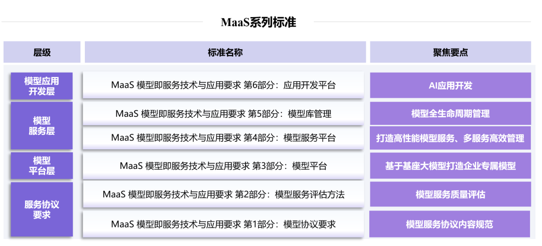 本系列標準圍繞MaaS落地中遇到的問題,聚焦模型定制、模型服務部署、模型管理、模型應用開發及模型服務能力等開展5個維度的研究,為大模型服務商和平臺供應商提供能力建設參考,為應用方提供技術選型參考。