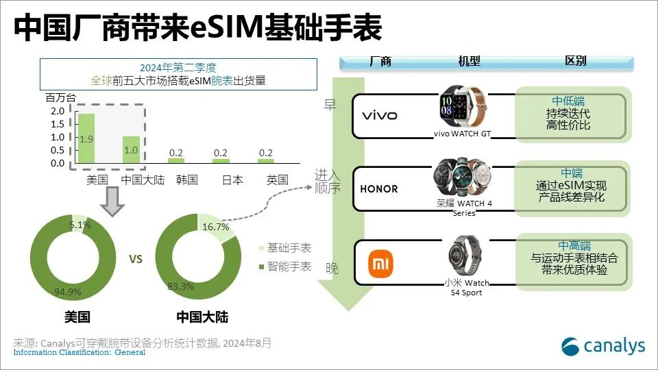 此外,Canalys 智能可穿戴數(shù)據(jù)顯示,中國市場 2024 年二季度 eSIM 設(shè)備出貨量僅次于美國,達到 100 萬臺,在連接方式中占比 10.8%。