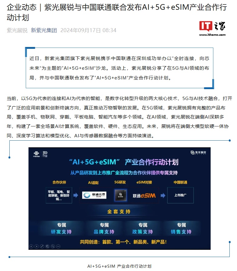 9 月 17 日消息,新紫光集團今日發(fā)文公布,旗下紫光展銳于 9 月 10 日同中國聯(lián)通聯(lián)合發(fā)布 AI+5G+eSIM 產(chǎn)業(yè)合作行動計劃。
