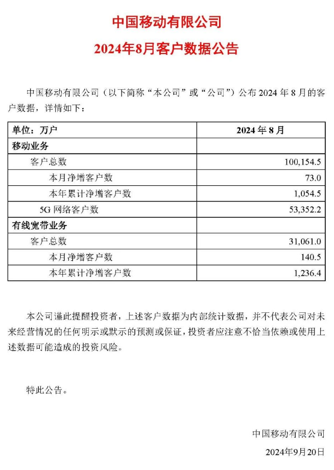 中國移動8月運營數據:5G網絡客戶累計達5.34億戶