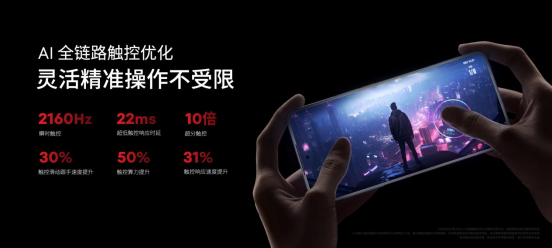 而至高 144Hz 高刷新率和 1-120Hz 自適應高刷技術的加持,使得用戶可根據顯示內容動態調整手機屏幕刷新率。搭配全面優化的 AI 全鏈路觸控技術,響應速度提升 50%,同時達到 10 倍超分觸控體驗,通過精細的觸摸分辨率增強,實現更加精準和靈敏的操作體驗。
