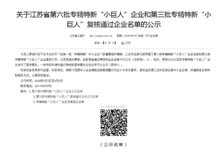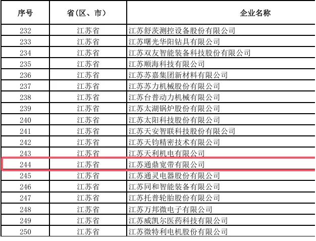 近日,根據國家工信部統一部署,江蘇省工業和信息化廳,發布了江蘇入選第六批國家級專精特新“小巨人”企業名單,江蘇通鼎寬帶有限公司成功入選。