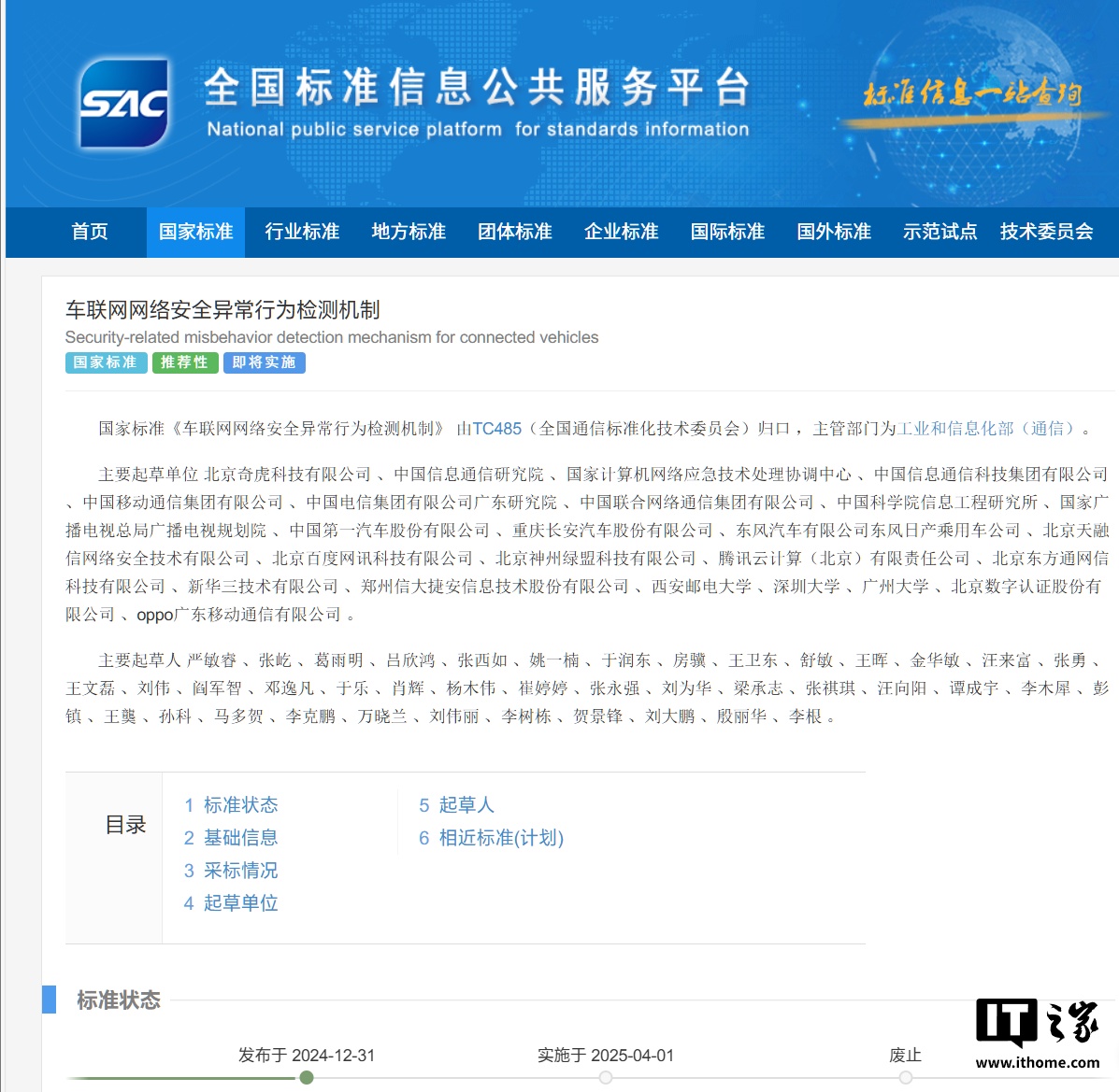 1 月 9 日消息,據全國標準信息公共服務平臺消息,《車聯網網絡安全異常行為檢測機制》(標準號 GB / T 45181-2024)已正式發布,并將從 2025 年 4 月 1 日起正式實施。