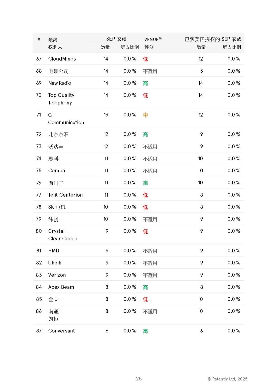 IT之家附 2025 年全球 5G 標準必要專利(SEP)百強權利人榜單如下: