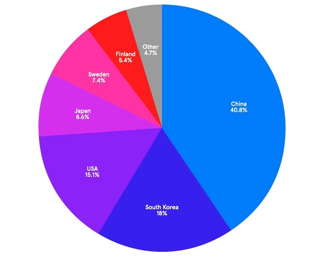 按最終權利人國別統計的 5G 標準必要專利(SEP)家族數量來看,中國排名第一,占比達 40.8%。