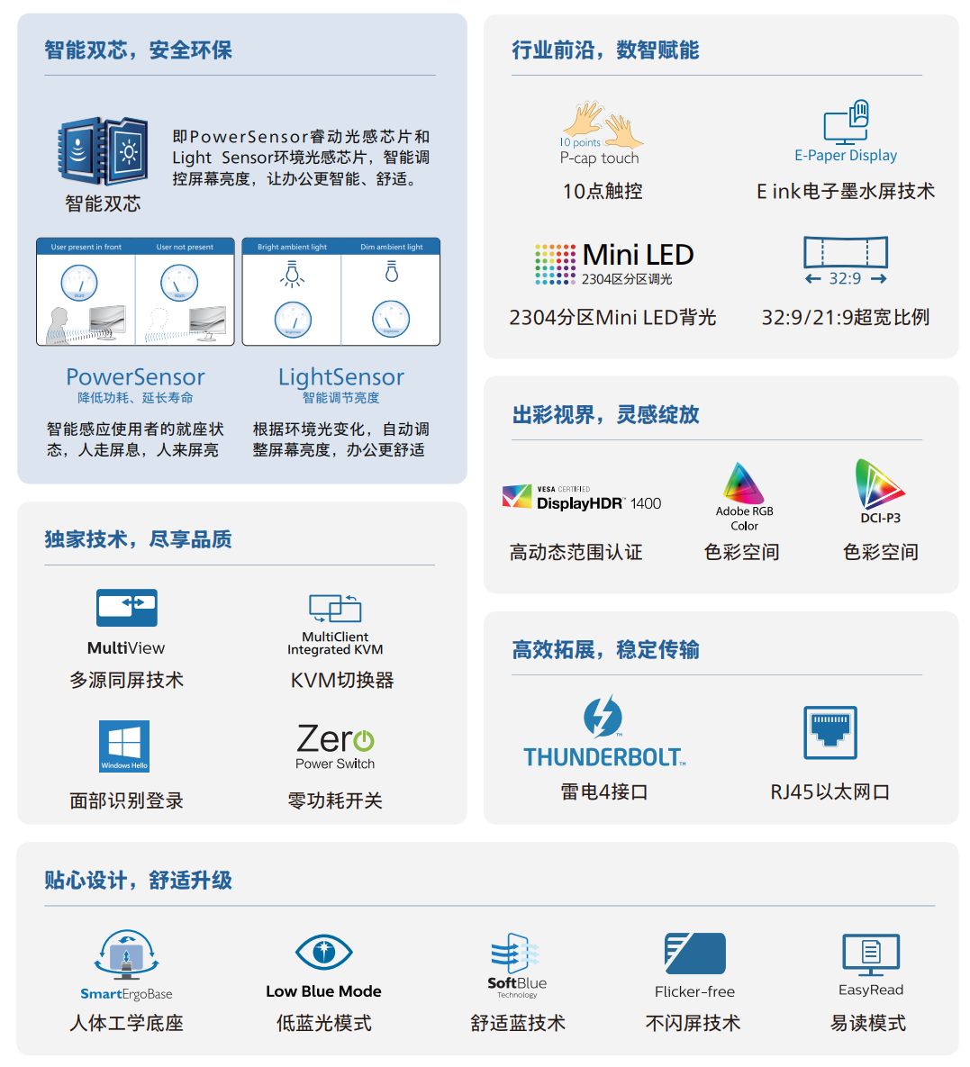 憑借其以客戶為中心的卓越技術創新能力,飛利浦商用顯示器推出了方屏、多比例超寬屏、曲面屏、觸摸屏以及便攜顯示器等一系列多樣化產品。同時,飛利浦還融入了windows hello™面部識別攝像頭、VESA認證的HDR顯示技術、內置音箱以及多源同屏等特色功能,為不同應用場景提供了全面的數字化視訊解決方案。這些創新科技滿足了各行業的差異化需求,為企業級客戶提供了高效、便捷的生產力工具。